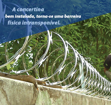 A concertina é uma barreira de segurança laminada, de forma espiralada possui lâminas pontiagudas, cortantes e penetrantes.