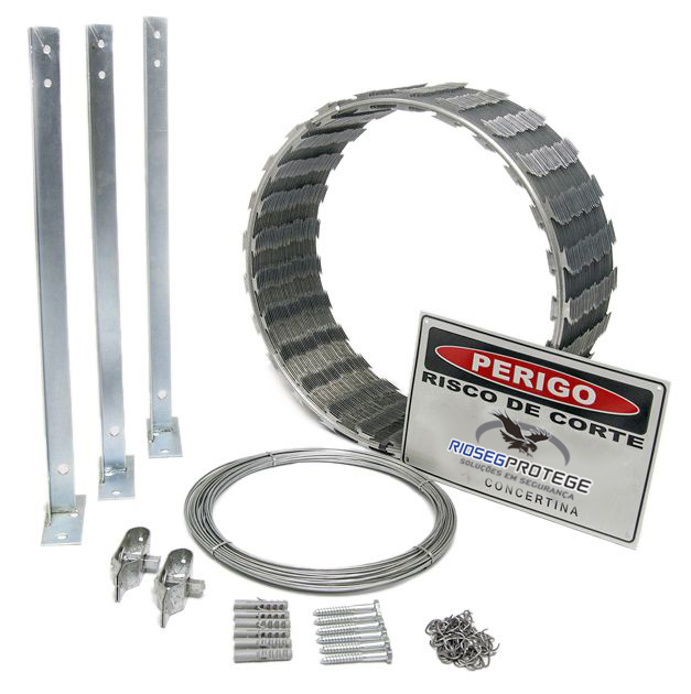 A concertina é uma barreira de segurança laminada, de forma espiralada possui lâminas pontiagudas, cortantes e penetrantes.